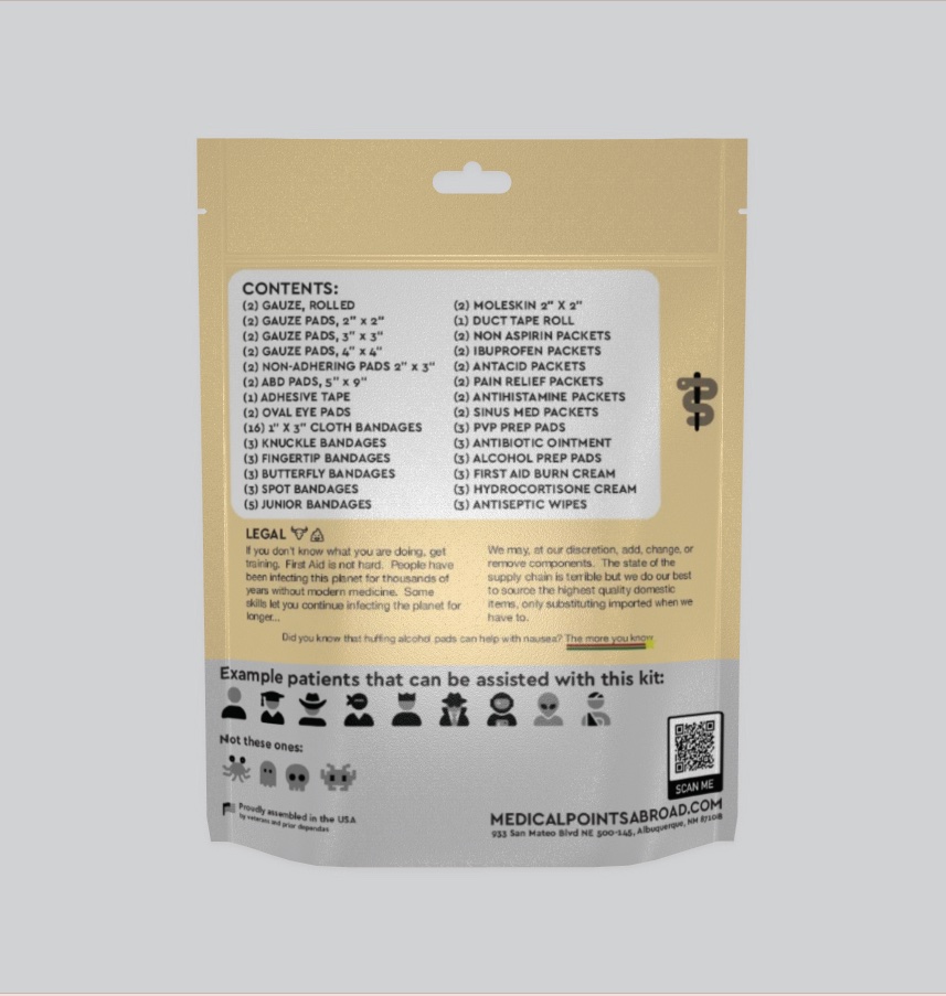 The Medical Points Abroad Bandages and Boo-Boos Kit contains all of the component you need to handle minor cuts, scrapes, burns, and abrasions–basically any minor soft tissue injury. Included are bandaids, gauze pads, and small packets of antiseptics. We also throw in some minor medications, individually packaged.